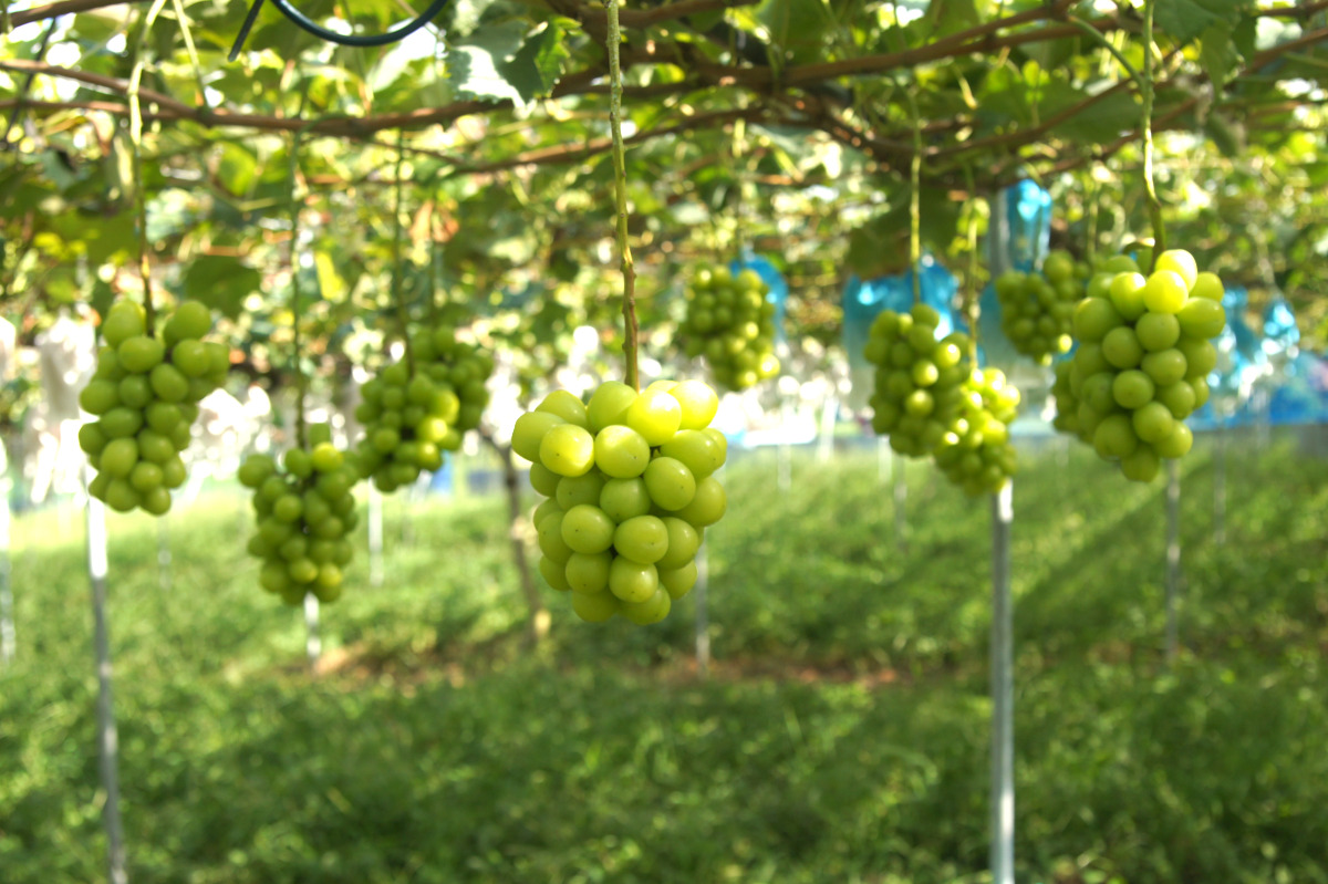 名産の高級品種。巨峰とマスカット種をかけ合わせた、黒い大粒の品種です。グレープ系の力強い味と香りに、マスカットの爽やかさが絶妙にバランス する、根強い人気の商品です。